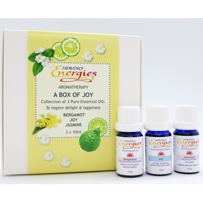 A collection of 3 x 10ml Pure Essential Oils & Blends to inspire delight and happiness.