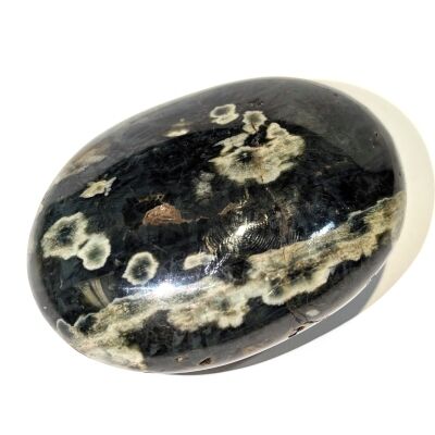 Ocean Jasper Smoothstone, with unusual flower-like patterns in colours of green and light taupe on a base of charcoal grey. and 2 keyholes on one side. Ocean Jasper is an rare variety of Jasper found only in Madagascar. It is a stone of joy and high spirits, releasing negativity and stress and bringing in relaxation, positive self-expression and physical and emotional healing. Approximate size 62mm long x 47mm wide x 26mm thick. (Info. abridged from The Pocket Book of Stones by Robert Simmons)
